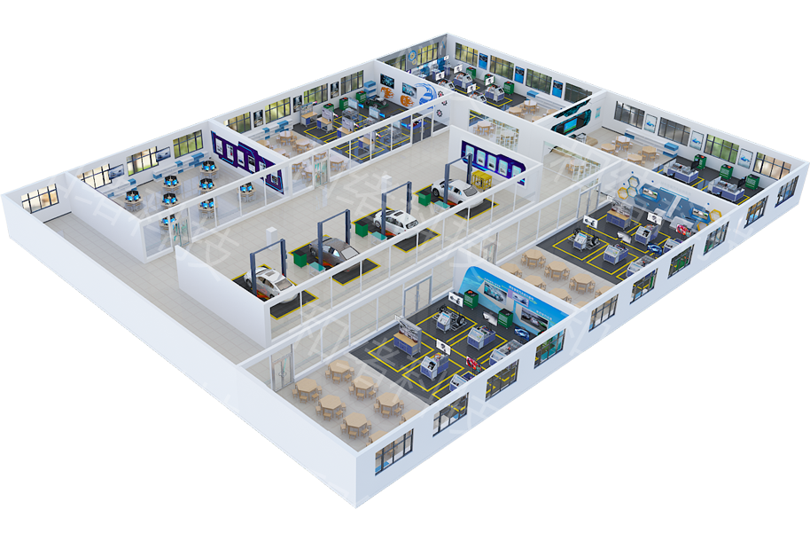 新能源汽车一体化实训中心围绕新能源汽车技术发展趋势,调研工作岗位需求、解析岗位职业能力要求,以工作任务为中心,打造“理虚实”一体化与工学结合的应用型人才教学实训中心。